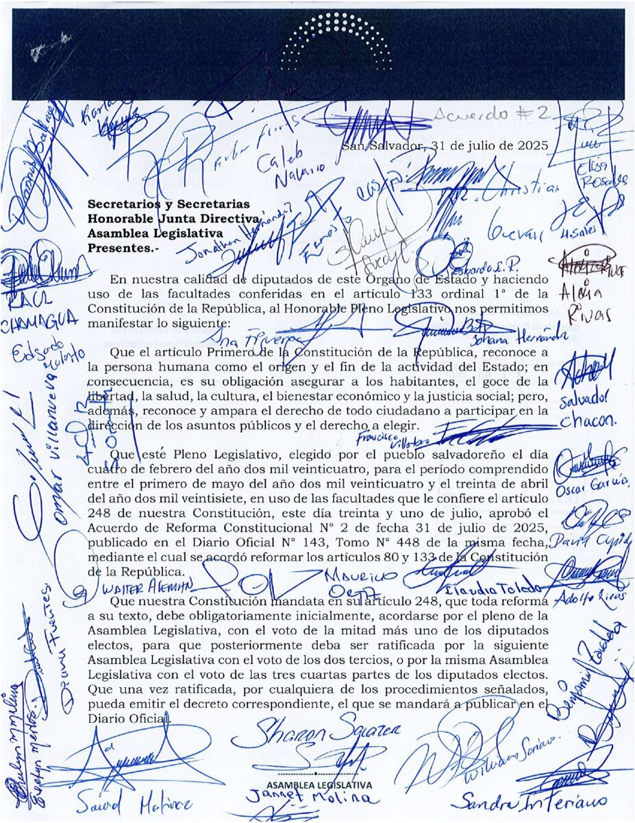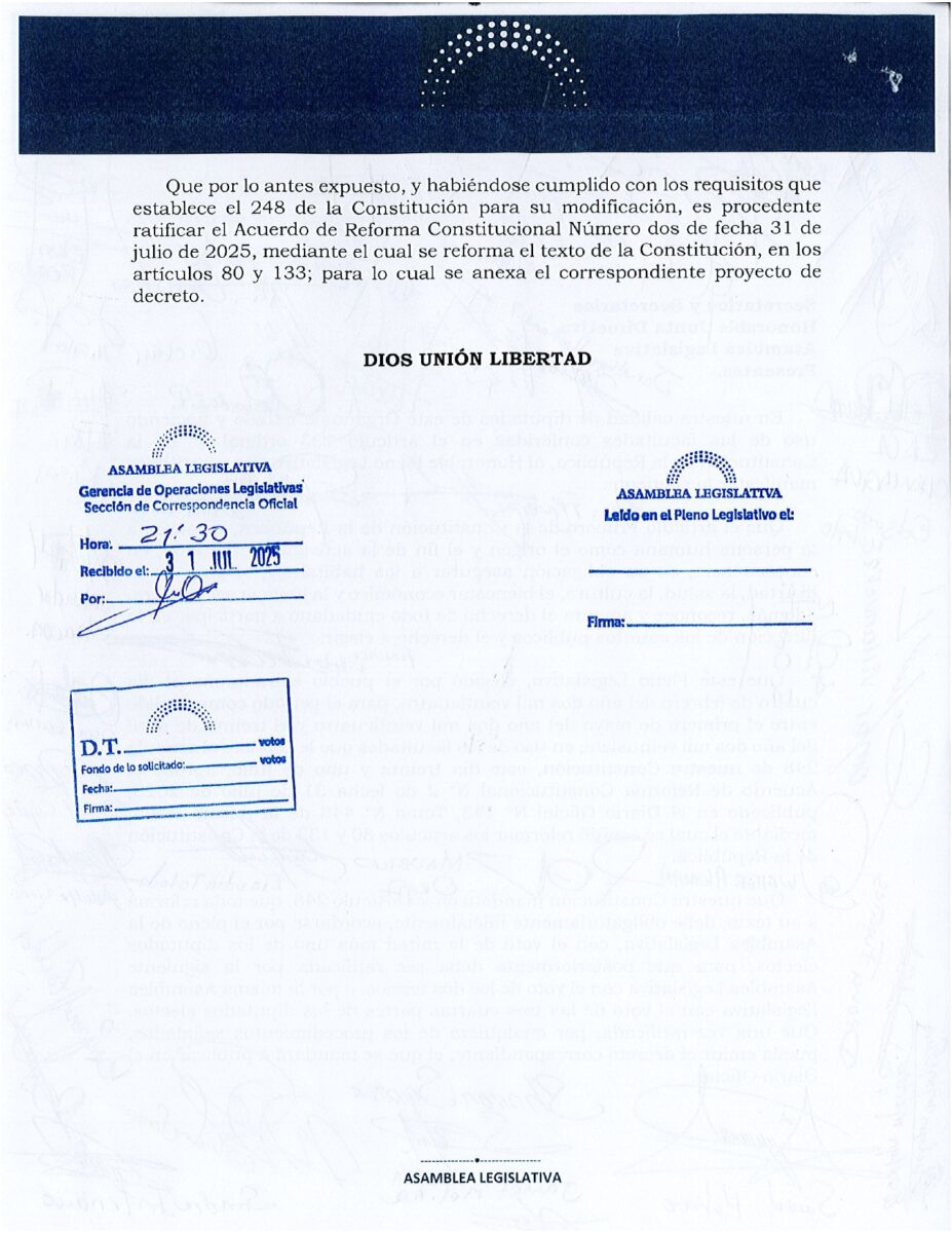 La Asamblea Legislativa aprobó y ratificó este 31 de julio, con 57 votos, una serie de reformas a la Constitución de la República, con el objetivo de actualizar el sistema electoral para fortalecer la democracia, optimizar recursos públicos y alinear las reglas con la voluntad popular. La modificación de ley fue a propuesta de la diputada de Nuevas Ideas, Ana Figueroa, quien fue respaldada por sus colegas de bancada.