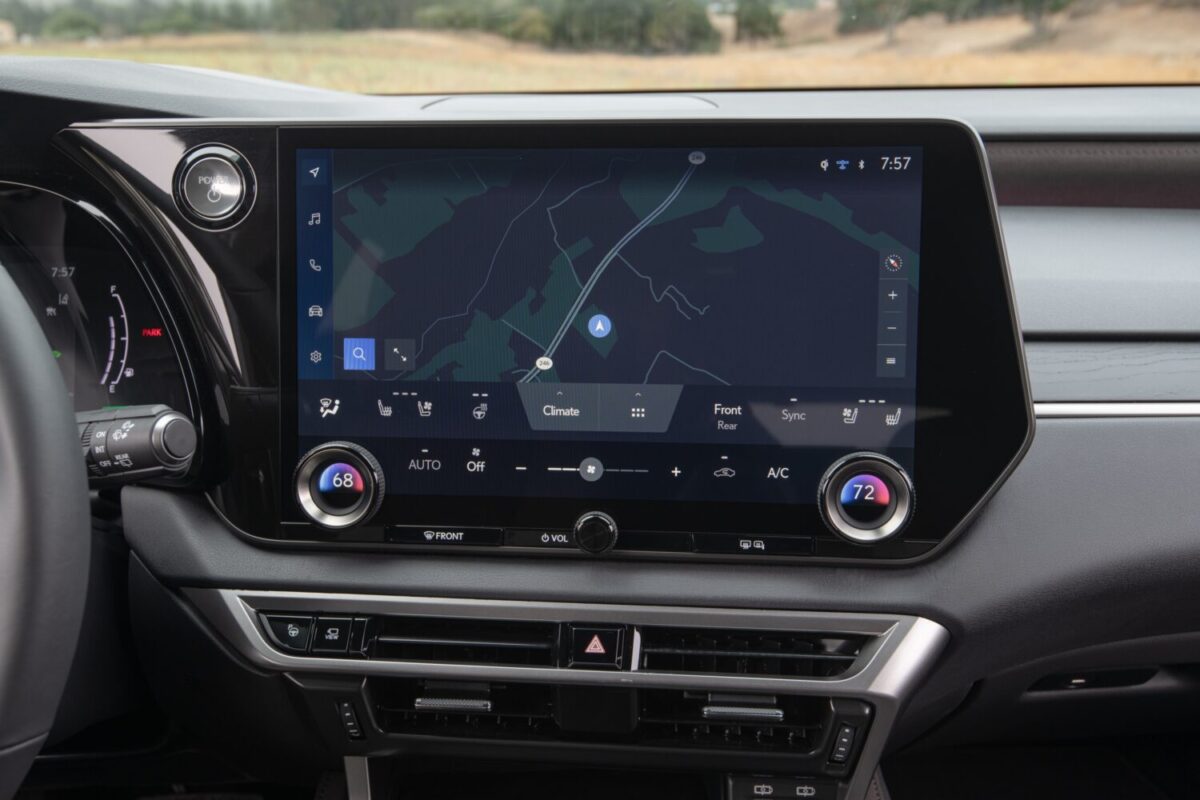 Una pantalla táctil de 9,8 pulgadas o 25 centímetros capta la atención en el centro del tablero, y existe la opción de una aún más grande de 14 pulgadas o 35 centímetros, en un conjunto que, si bien no armoniza bien con el entorno, sí realza el lujo de la cabina. La pantalla está ligeramente inclinada hacia el conductor y utiliza la última interfaz de software de Lexus, lo que evidentemente es una progresión sustancial respecto de sistemas anteriores, sobre todo de aquellos que teníamos que manejar mediante un incómodo procedimiento similar a una almohadilla de computadora.