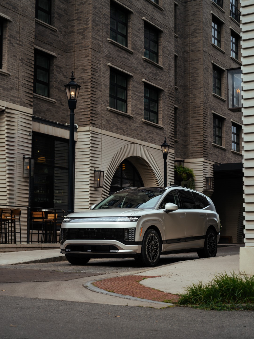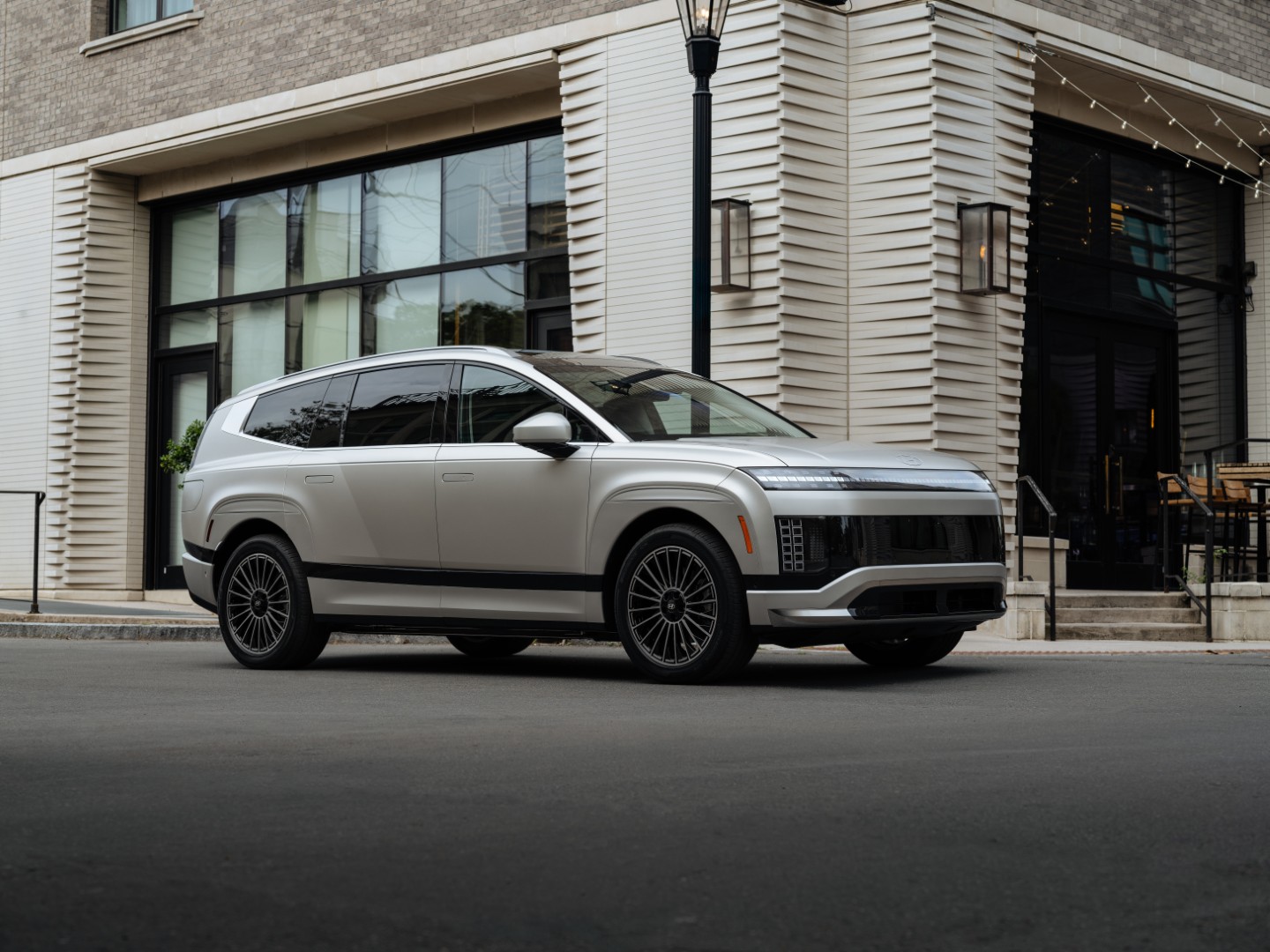 Las dimensiones son considerables, incluso mayores que el Kia EV9, pero tiene un estilo mucho más suave que este, con líneas redondeadas y un frente caracterizado por una línea completa de luces diurnas inspiradas en la forma cuadrada de píxeles. Las luces posteriores y las de freno también replican este diseño y se extienden hacia arriba para esbozar los lados del vehículo y el techo.
