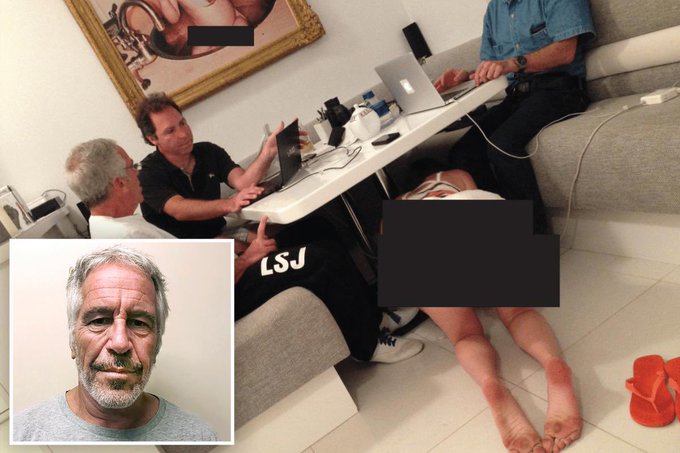En la imagen, Epstein y los otros dos hombres aparecen sentados, trabajando tranquilamente frente a sus computadoras portátiles alrededor de una mesa, mientras una mujer descalza con atuendos blancos se arrastra debajo de esta.