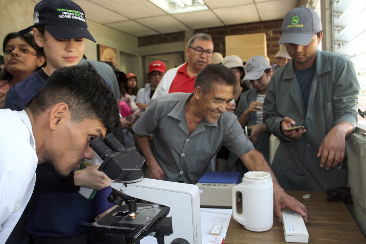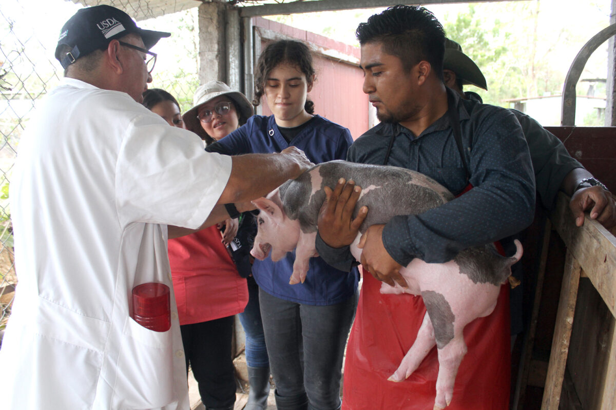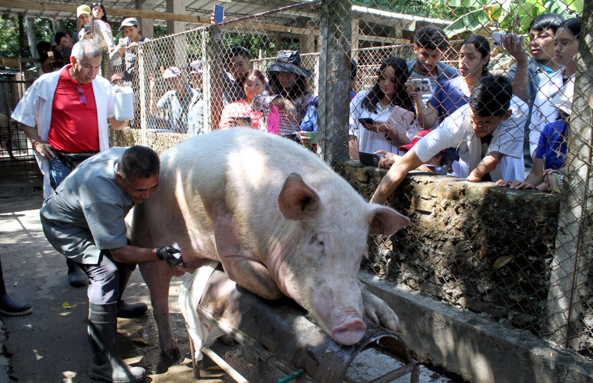 Después de verificar la estructura de los cerdos, se trasladan al Ministerio de Agricultura y Ganadería, ahí los espera el técnico Mario González, quien enseña a los futuros profesionales, el proceso de extracción de semen. El trabajo se hace con cuidado, precaución y concentración, para evitar un accidente.